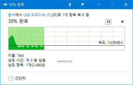▲ 마찬가지로 4GB짜리 단일 파일 복사 하는데 그래프가 들쑥날쑥 하는게 보이듯이 속도가 5~20MB/s 변덕이 심한 편입니다