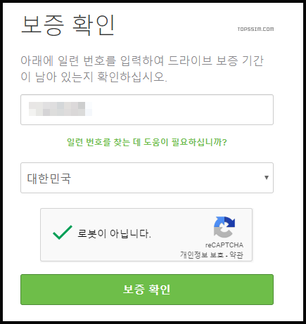 ▲ 보증 확인 메뉴에서 간단한 시리얼 조회를 통해 남은 AS 보증 기간을 확인할 수 있습니다. 시리얼 번호를 입력하고 ‘로봇이 아닙니다.’ 를 체크 합니다